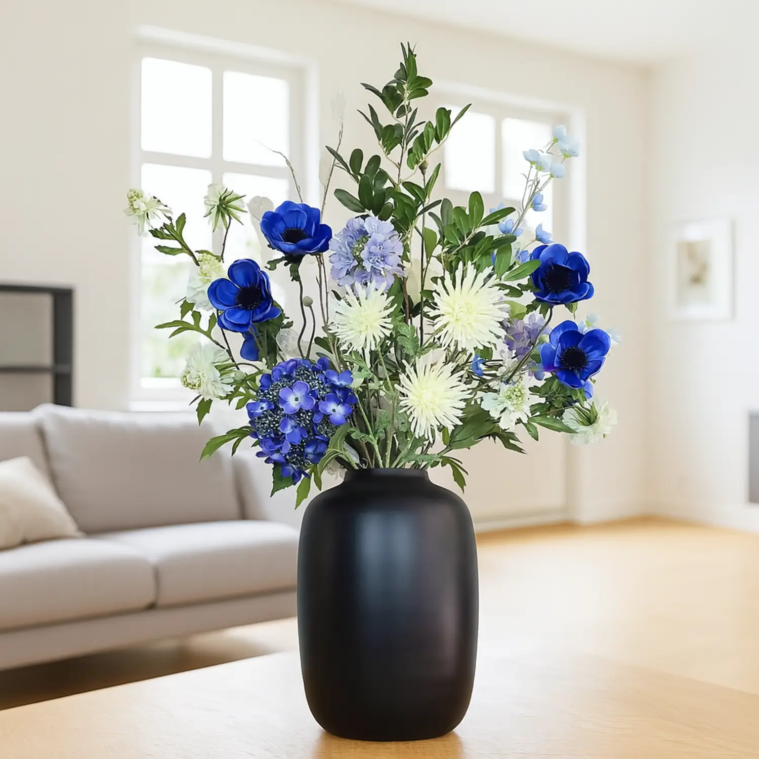 Dit luxe boeket met witte en blauwe zijden bloemen, geschikt voor vaas maat M, zorgt voor een elegante uitstraling in jouw interieur. Bestel nu en laat dit chique boeket rechtstreeks bij jou thuis bezorgen.